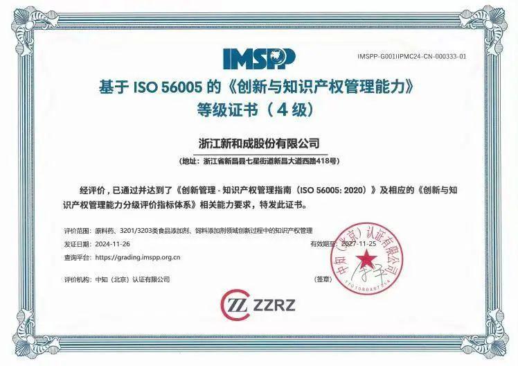 近日,新和成在創(chuàng)新與知識產(chǎn)權(quán)管理的征途上,又邁出了堅(jiān)實(shí)的一步——成功榮獲ISO 56005體系四級認(rèn)證,成為浙江省第三家、紹興市首家通過四級認(rèn)證的企業(yè)。這一殊榮不僅是對新和成持續(xù)不懈努力的肯定,更標(biāo)志著公司的創(chuàng)新和知識產(chǎn)權(quán)管理水平上了新臺階。